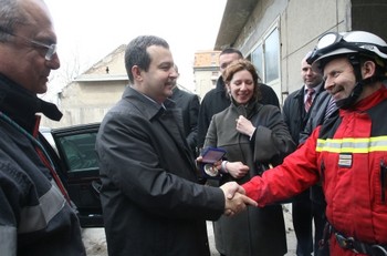 Београд, 26. март 2009. године – Први потпредседник-заменик председника Владе и министар унутрашњих послова Ивица Дачић и амбасадор Француске у Београду Жан-Франсоа Терал присуствовали су данас показној вежби спасавања људи из рушевина, коју су извели специјални тимови МУП-а.