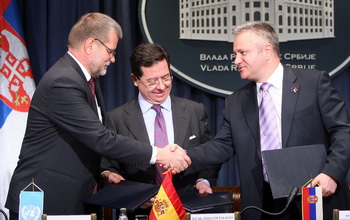 Београд, 6. април 2009. године – Потпредседник Владе и министар економије и регионалног развоја Млађан Динкић, амбасадор Шпаније Ињиго де Паласио Еспања и стални координатор тима УН у Србији Ленарт Коцалајнен потписали су данас Споразум о спровођењу програма "Подршка националним напорима за промовисање запошљавања младих и управљање миграцијама".