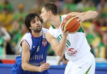 | Милош Теодосић (лево) је започео серију "тројки" којом је Србија славила победу против Литваније |