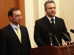 Николај Василев и Млађан Динкић обраћају се новинарима по завршетку састанка |