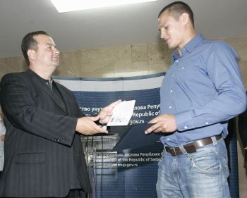Београд, 16. август 2011. године – Заменик председника Владе Републике Србије и министар унутрашњих послова Ивица Дачић уручио је данас уверење о држављанству, личну карту и пасош руском џудисти Дмитрију Герасименку, који наступа за ЏК “Црвена звезда”.