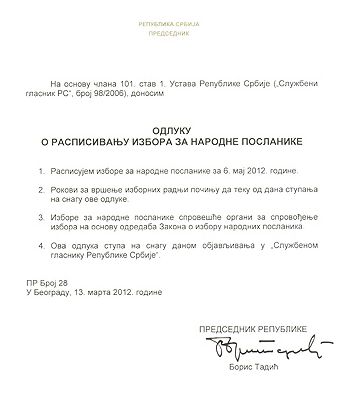Београд, 13. март 2012. године – Председник Републике Србије Борис Тадић расписао је данас за 6. мај изборе за Народну скупштину Србије.