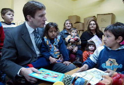 Београд, 12. јануар 2005. године - Министар просвете и спорта у Влади Републике Србије Слободан Вуксановић поделио је данас књиге деци у ромском вртићу "Плава птица", који због финансијских потешкоћа не ради већ шест месеци.
