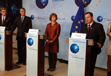 Заједничкој конференцији за новинаре, поред Дачића, присуствовали су и високи представник ЕУ за спољну политику и безбедност Кетрин Ештон и представник привремених институција самоуправе на Косову Хашим Тачи.