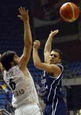 Пера Божић (лево, Партизан) у дуелу са бившим играчем "црно-белих" а сада плејмејкером Климамиа Милошем Вујанићем |