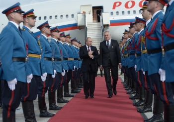 Београд, 16. октобар 2014. године – Председник Републике Србије Томислав Николић дочекао је данас председника Руске Федерације Владимира Путина, који ће током посете Београду разговарати са државним врхом и присуствовати обележавању 70-годишњице ослобођења Београда и победе над фашизмом и 100-годишњице почетка Првог светског рата.
