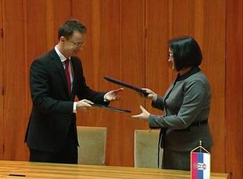Београд, 20. новембар 2014. године – Министар пољопривреде и заштите животне средине у Влади Републике Србије Снежана Богосављевић-Бошковић и министар спољних послова и спољне трговине Мађарске Петер Сијарто потписали су данас протокол о даљим правцима економске сарадње двеју земаља.