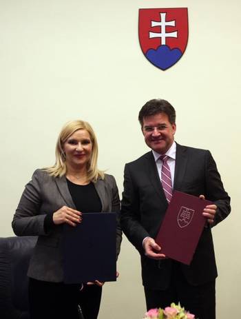 Београд/Братислава, 1. децембар 2014. године – Потпредседник Владе Републике Србије и министар грађевинарства, саобраћаја и инфраструктуре Зорана Михајловић и потпредседник Владе Словачке и министар спољних и европских послова Мирослав Лајчак потписали су данас у Братислави Споразум о међународном комбинованом транспорту између две земље.