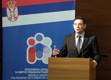 Београд, 26. децембар 2014. године – Министар за рад, запошљавање, борачка и социјална питања у Влади Републике Србије Александар Вулин изјавио је данас да би требало ојачати улогу Републичке агенције за мирно решавање радних спорова како би се што већи број радника и послодаваца обраћао за помоћ и посредовање у решавању проблема.