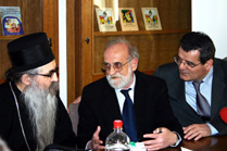 Слева: Његово Преосвештенство Епископ бачки Иринеј, министар вера у Влади Републике Србије Милан Радуловић и директор Завода за уџбенике и наставна средства Радош Љушић |