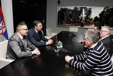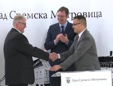 Сремска Митровица, 30. јануар 2015. године – Председник Владе Републике Србије Александар Вучић присуствовао је данас уручењу кључева новом власнику фабрике “Митрос” у Сремској Митровици – аустријској компанији “Герлингер холдинг”, која ће у првој фази запослити 380 радника и уложити 16 милиона евра у нову опрему.