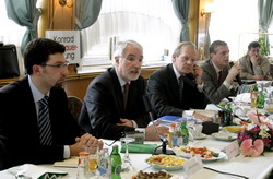 Београд, 18. март 2005. године - Потпредседник Владе Републике Србије и шеф преговарачког тима Србије са Европском унијом Мирољуб Лабус разговарао је данас са новинарима на тему "Србија у процесу стабилизације и придруживања", у оквиру пројекта који организују Канцеларија Владе Србије за придруживање ЕУ и Фондација "Конрад Аденауер".