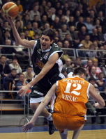 Бивши кошаркаш београдског Партизана а сада грчког Македоникоса Драган Луковски (лево) у дуелу са Савом Ђикановићем |