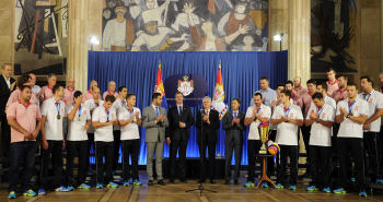 Београд, 9. август 2015. године – Министар омладине и спорта Вања Удовичић присуствовао је данас пријему који су за репрезентативце Србије у ватерполу, који су освојили златну медаљу на Светском првенству у Казању, приредили председник Србије Томислав Николић и председник Владе Републике Србије Александар Вучић.
