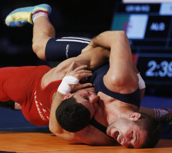 Детаљ са меча за бронзану медаљу: Тарек Азиз Бенаиса (Алжир) и Давор Штефанек (десно)