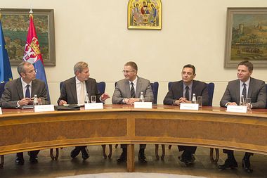 Београд, 25. септембар 2015. године – Министар унутрашњих послова у Влади Републике Србије Небојша Стефановић и министар за рад, запошљавање, борачка и социјална питања Александар Вулин разговарали су данас са европским комесаром за суседску политику и проширење Јоханесом Ханом о актуленој мигрантској кризи и европским интеграцијама Србије.