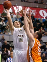Центар Партизана Коста Перовић шутира преко играча Хемофарма Саве Ђикановића |