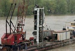 Београд, 25. април 2005. године - Припадници ронилачке екипе Жандармерије и Речне ратне фротиле Војске СЦГ у сарадњи са стручњацима грађевинске компаније "Иван Милутиновић" извукли су јуче ујутро