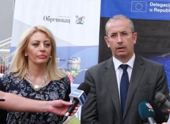 Обреновац, 29. јул 2016. године – Министар без портфеља у Влади Републике Србије задужен за европске интеграције Јадранка Јоксимовић и шеф Делегације Европске уније у Србији Мајкл Девенпорт присуствовали су данас у Обреновцу додели кључева станова за 32 породице које су биле погођене поплавама 2014. године.