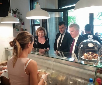 Београд, 28. јул 2017. године – Министар за рад, запошљавање, борачка и социјална питања у Влади Републике Србије Зоран Ђорђевић и амбасадори САД и Аустралије Кајл Скот и Џулија Фини посетили су данас социјално предузеће "Багел Бејгл", чији се профит користи за финансирање програма подршке жртвама трговине људима.