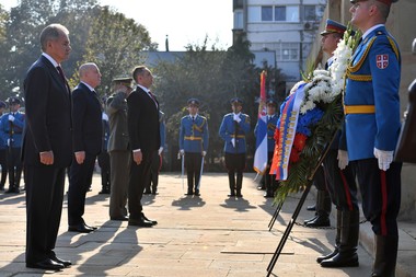 Делегација руских ратних ветерана, предвођена генералима Михаилом Алексејевичем Мојсејевим и Виктором Федоровичем Ермаковим, положила је венце на Споменик совјетским ветеранима на Авали.