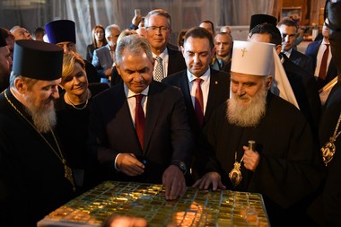 Министри одбране Владе Републике Србије и Руске Федерације Александар Вулин и Сергеј Шојгу посетили су данас поподне са сарадницима храм Светог Саве на Врачару где су се сусрели са патријархом Српске православне цркве Иринејем.