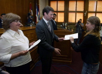 Београд, 24. јун 2005.године - Три средњошколца награђена су данас у Скупштини Србије на конкусу за најбољи писмени рад на тему "Кад бих био премијер", који су организовали Министарство просвете и спорта Владе Републике Србије и Мисија ОЕБС-а у Србији и Црној Гори.