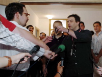 Београд, 25. јул 2005. године - Министар финансија у Влади Републике Србије Млађан Динкић и директор Пореске управе Владимир Илић присуствовали су јуче уручењу кључева од стана добитнику наградне игре "Најсрећнији рачун" Горану Јовицину.