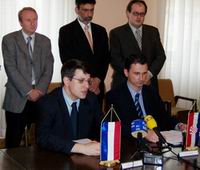 Загреб, 14. мај 2004. године - Министар науке и заштите животне средине у Влади Републике Србије Александар Поповић боравио је данас у Загребу. У току посете, која представља први званични сусрет представника нове Владе Србије и званичника Владе Републике Хрватске, Поповић се састао са министром знаности, образовања и спорта Драганом Приморцем.