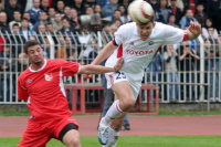 Никола Жигић (бели дрес, Црвена звезда) и играч домаће екипе Иван Бојовић у борби за лопту |