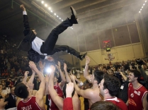 | Тренер ФМП-а Влада Вукоичић на рукама својих пулена |