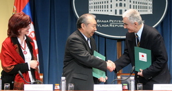 Београд, 16. фебруар 2007. године - Директор Основне школе "Десанка Максимовић" у Новом Пазару Сумера Халилагић, директор Дома за одрасла инвалидна лица у Земуну Велимир Кнежевић и амбасадор Јапана у Србији Тадаши Нагаи потписали су данас у Влади Србије уговоре о донацији Владе Јапана у вредности од 128 хиљада евра.