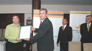 | Владимир Илић (десно) предаје Братиславу Ђорђевићу, власнику фирме "Стефи комерц''', БАТ-ову награду за најуспешнијег малог привредника у Врању за 2007. годину |