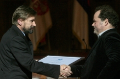 Главни и одговорни уредник часописа "Економист" Мијат Лакићевић (лево) додељује награду "Виртус" представнику медијске куће Б92 Гордану Пауновићу |