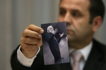 | Расим Љајић показује новинарима фотографију Радована Караџића са дугом белом брадом и косом |