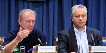 | Представник репрезентативних синдиката "Заставе" Зоран Михајловић и Млађан Динкић |