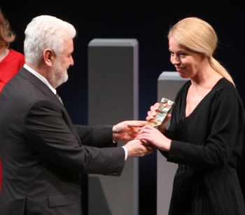 | Мирко Цветковић уручује специјалну награду Ружици Ђинђић, председници Управног одбора Фонда „Др Зоран Ђинђић" |
