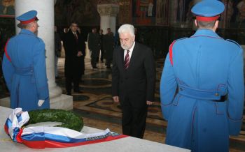 Топола, 15. фебруар 2011. године – Председник Владе Републике Србије Мирко Цветковић положио је данас, поводом Дана државности Србије, ловоров венац на саркофаг вожда Карађорђа у цркви Светог Ђорђа на Опленцу у Тополи и одао пошту јунацима Првог српског устанка.