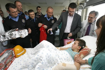 Београд, 31. март 2011. године – Помоћник министра унутрашњих послова и начелник Сектора за ванредне ситуације Предраг Марић и припадници ватрогасно-спасилачке бригаде посетили су данас у Институту за мајку и дете осмогодишњег дечака који је пре неколико дана био прикљештен у лифту у згради у Земуну.