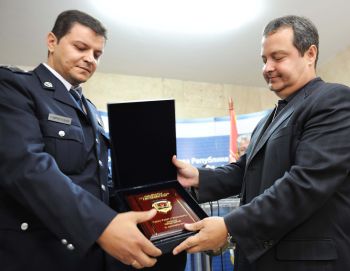 Београд, 12. септембар 2011. године – Заменик председника Владе Републике Србије и министар унутрашњих послова Ивица Дачић примио је данас припадника полицијске станице Вождовац Радета Гавриловића, који је у понедељак у Београду, ван дужности, на углу Устаничке и Крушевачке улице спасао возача комбија од тројице хулигана.