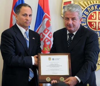 Београд, 15. септембар 2011. године – Регионални асистент аташеа Министарства за унутрашњу безбедност САД Грант Лукас уручио је данас плакету захвалности Одељењу за борбу против високотехнолошког криминала СБПОК-а МУП-а Србије за постигнуте резултате у борби против дечје порнографије на интернету у акцији “Армагедон” и за одличну међународну безбедносну сарадњу.