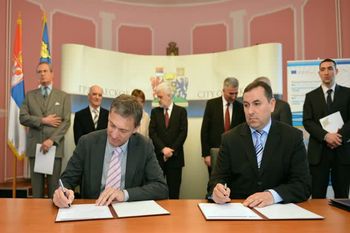 Шеф Делегације Европске уније у Србији Венсан Дежер и представник компаније "Штрабаг" Ивица Будиша потписали су Уговор о изградњи централног постројења за прераду отпадних вода у Лесковцу.