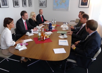 Београд, 10. септембар 2012. године – Први потпредседник Владе задужен за одбрану, безбедност и борбу против корупције и криминала и министар одбране Александар Вучић састао се на почетку званичне посете Немачкој са замеником генералног секретара „Конрад Аденауер Фондације“ Герхардом Валерсом.
