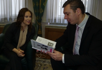 Београд, 26. октобар 2012. године – Први потпредседник Владе Републике Србије и министар одбране Александар Вучић одиграо је данас у згради Владе Србије партију шаха са најбољом шахисткињом на свету Јудит Полгар, која борави први пут у Београду као специјални гост Сајма књига.