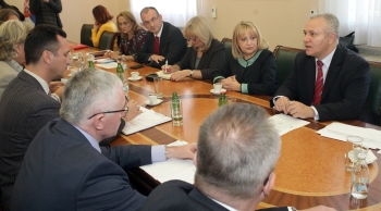 | Млађан Динкић и министар здравља Славица Ђукић-Дејановић током данашњег разговора са представницима фармацеутске индустрије |
