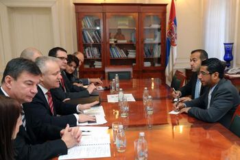 Београд, 5. фебруар 2013. године – Министар финансија и привреде Млађан Динкић и министар пољопривреде, шумарства и водопривреде Горан Кнежевић разговарали су данас са директором Развојног фонда Абу Дабија Мохамедом Саифом Ал Суваидијем и пројект менаџером тог фонда Рашидом Ал Кабијем.