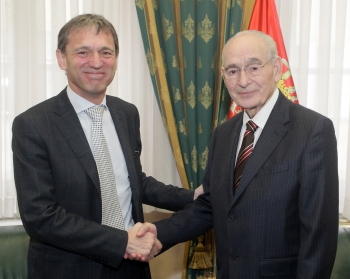 Београд, 12. фебруар 2013. године – Потпредседник Владе Републике Србије и министар рада, запошљавања и социјалне политике Јован Кркобабић разговарао је данас са шефом Делегације ЕУ у Србији Венсаном Дежером и замеником директора Развојне банке СЕ, која је администратор Међународног донаторског фонда, Стефаном Селеном.