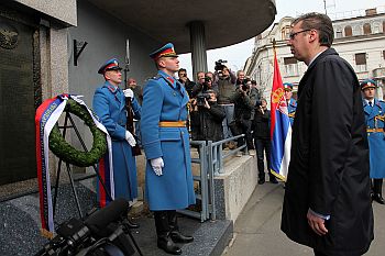Београд, 24. март 2013. године – Први потпредседник Владе и министар одбране Александар Вучић положио је данас, поводом обележавања Дана сећања на страдале у НАТО бомбардовању, венац крај спомен-обележја припадницима Ратног ваздухопловства и противваздухопловне одбране у Земуну.