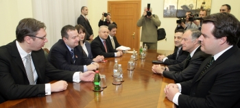Београд, 25. март 2013. године – Председник Владе Републике Србије и министар унутрашњих послова Ивица Дачић, први потпредседник Владе и министар одбране Александар Вучић и министар финансија и привреде Млађан Динкић разговарали су данас са потпредседником Форбс издавачке компаније Кристофером Форбсом о могућностима промоције Србије као инвестиционог подручја.