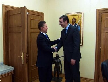 Београд, 27. март 2013. године – Први потпредседник Владе Републике Србије задужен за одбрану, безбедност и борбу против криминала и корупције и министар одбране Александар Вучић разговарао је данас са председником Извршног одбора компаније “Гаспром” Алексејем Милером који борави у званичној посети Београду, где је потписао Уговор о испоруци руског природног гаса Србији.